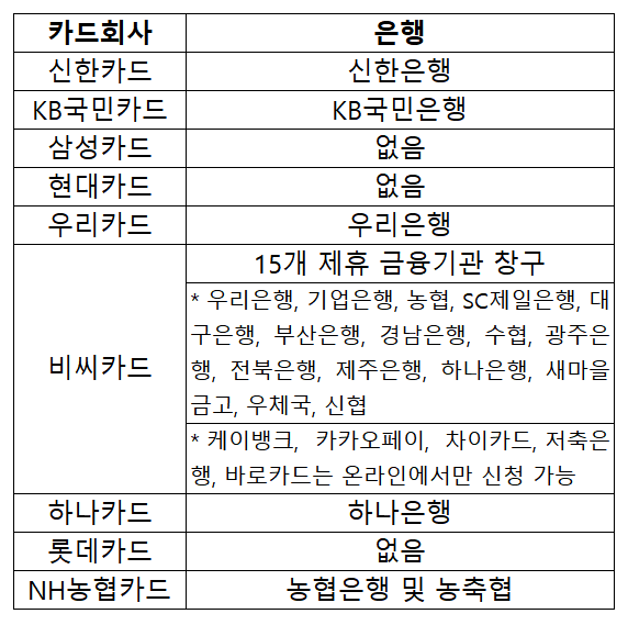 신용카드, 체크카드에 충전하는 방식으로 국민지원금 지급받기를 원하시는 분은 카드와 연계된 은행 창구를 방문하여 신청이 가능합니다. 카드별 신청 가능한 은행은 아래 표와 같습니다. 카카오 뱅크, 카카오페이의 경우에는 앱으로만 신청이 가능하며 오프라인 창구는 없습니다.