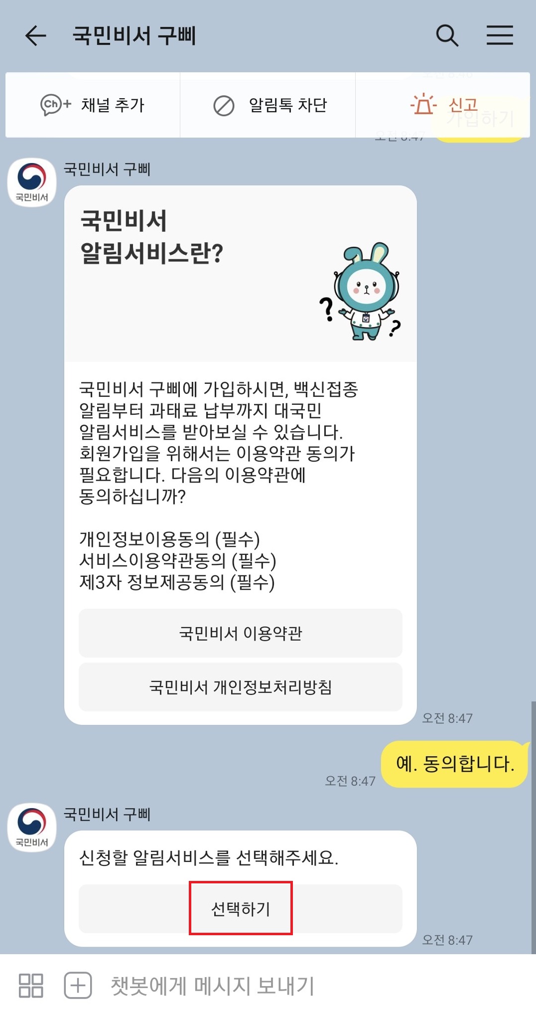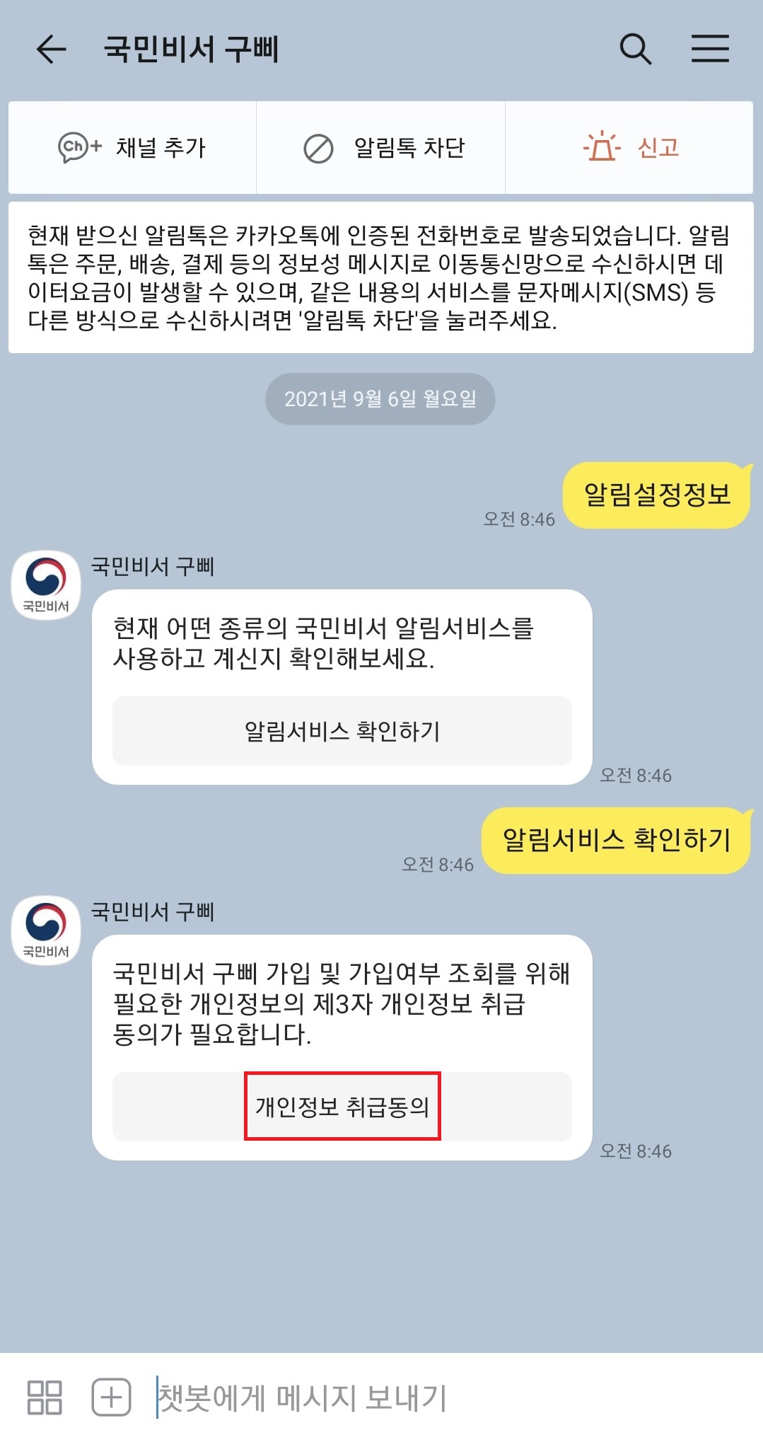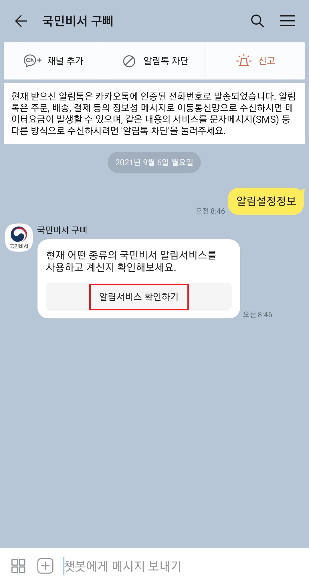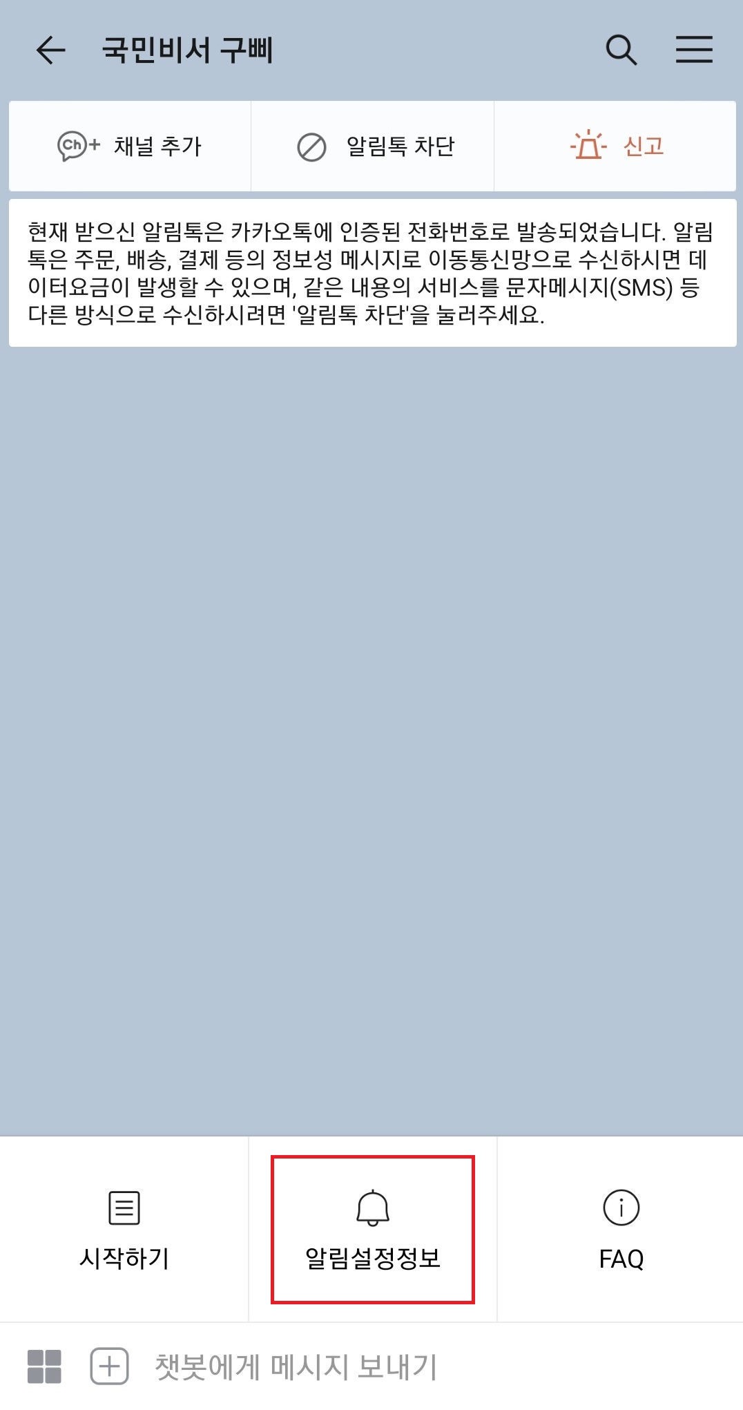 국민비서 구삐를 채널 추가를 하거나 채널추가 왼쪽의 로봇 모양의 이미지가 그려져있는 아이콘을 클릭하셔서 국민비서 구삐 채팅창으로 들어가 주세요. 거기서 알림설정정보 버튼을 클릭 해 주세요.