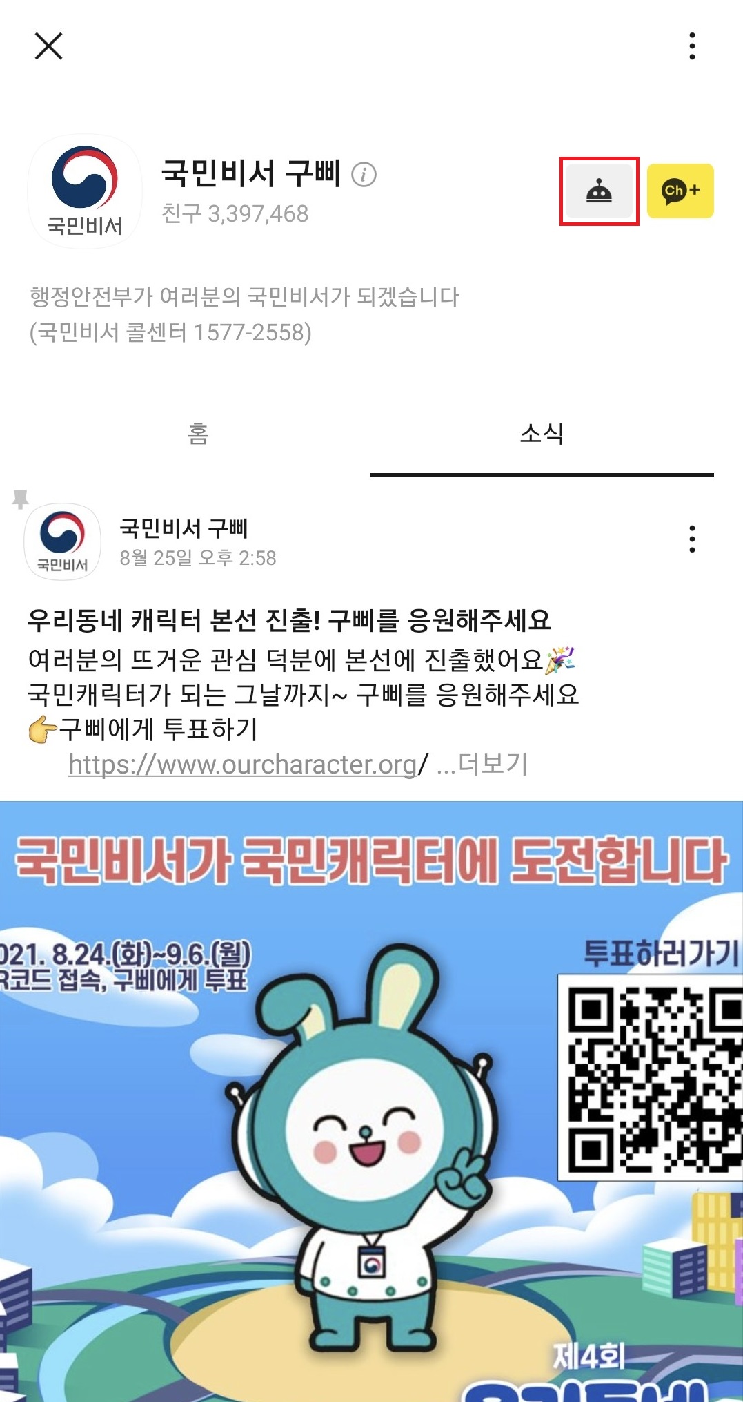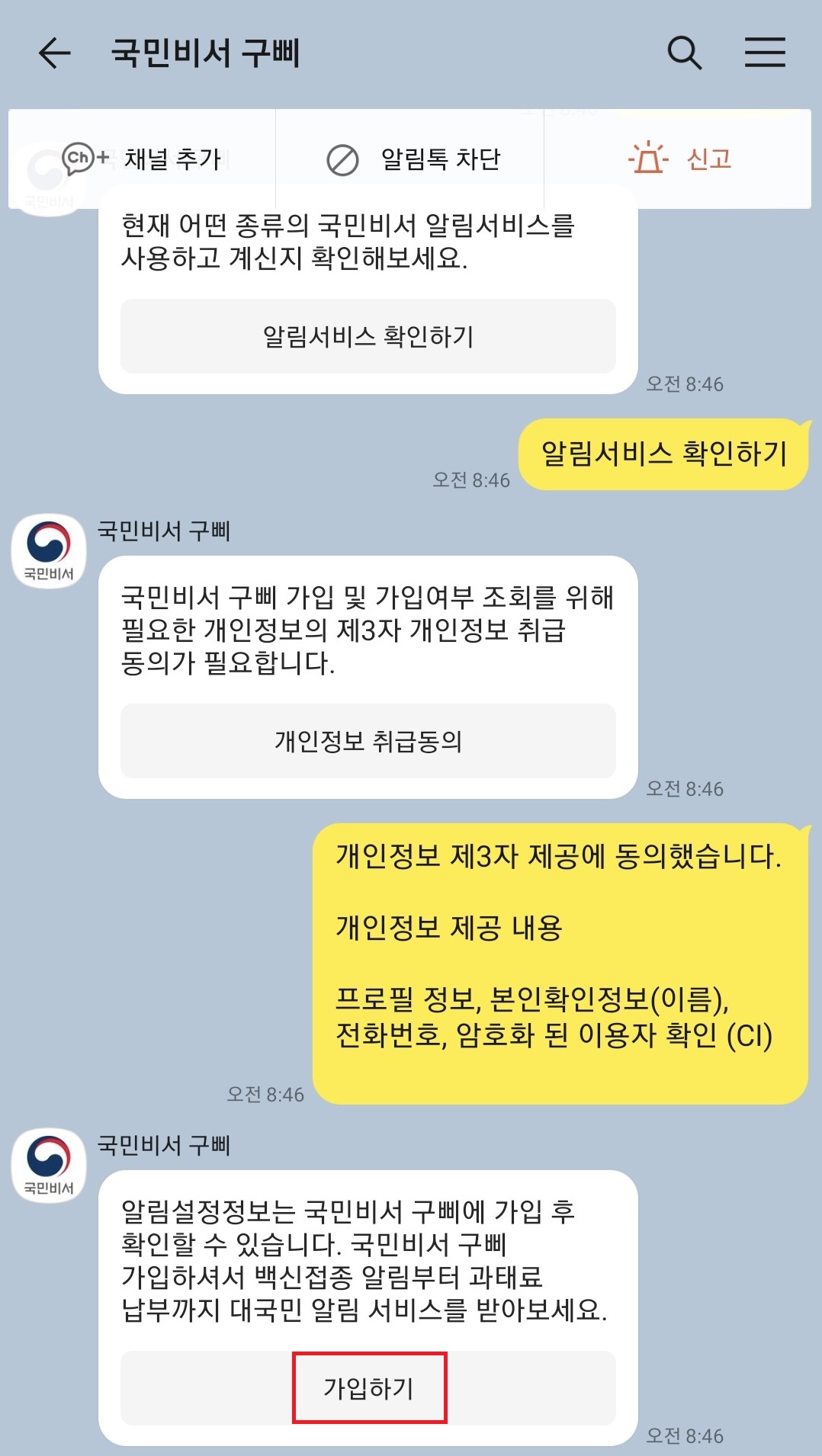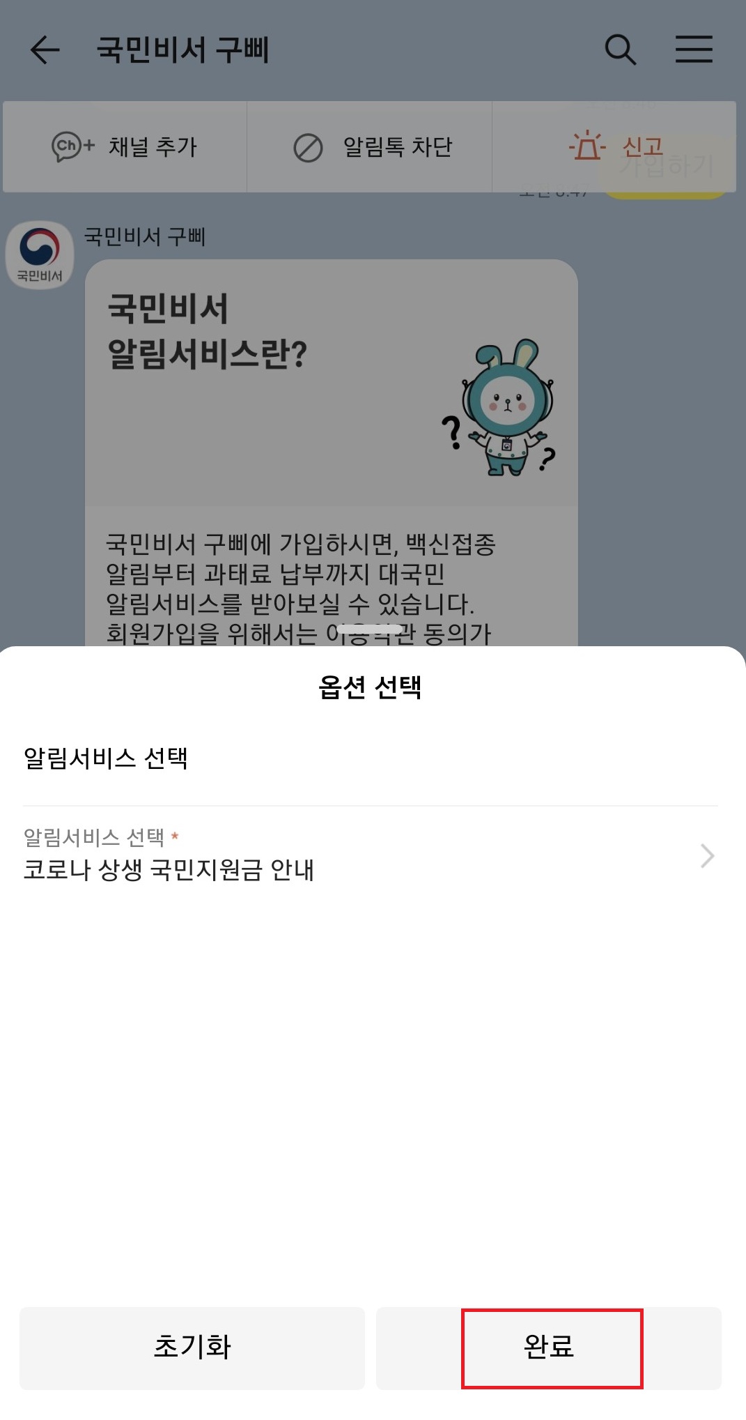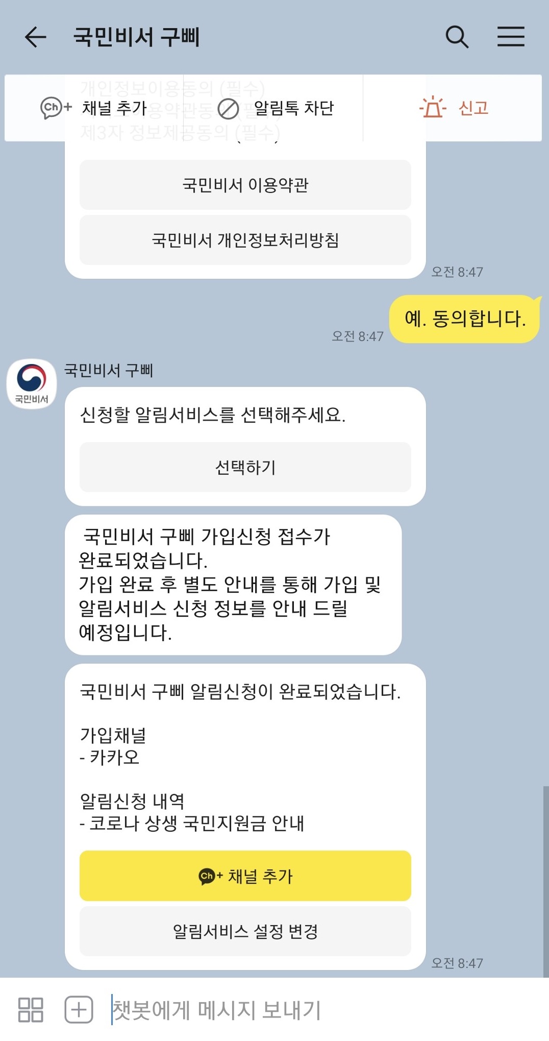 국민비서 구삐를 채널 추가를 하거나 채널추가 왼쪽의 로봇 모양의 이미지가 그려져있는 아이콘을 클릭하셔서 국민비서 구삐 채팅창으로 들어가 주세요. 거기서 알림설정정보 버튼을 클릭 해 주세요.