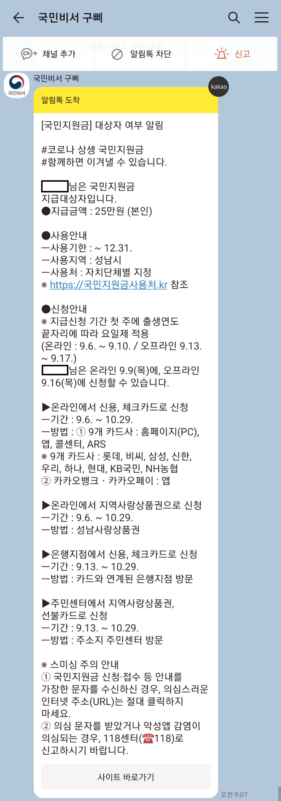 최종적으로 완료 버튼까지 누르면 국민비서 구삐 코로나 상생 국민지원금 알림 서비스 신청이 완료된 것입니다. 이렇게 신청을 했더니 저는 오늘 오전 9시 7분경에 제가 코로나 국민지원금 지급 대상이라는 것, 그리고 어떻게 신청하면 되는지 신청 안내에 대한 메시지가 왔습니다.