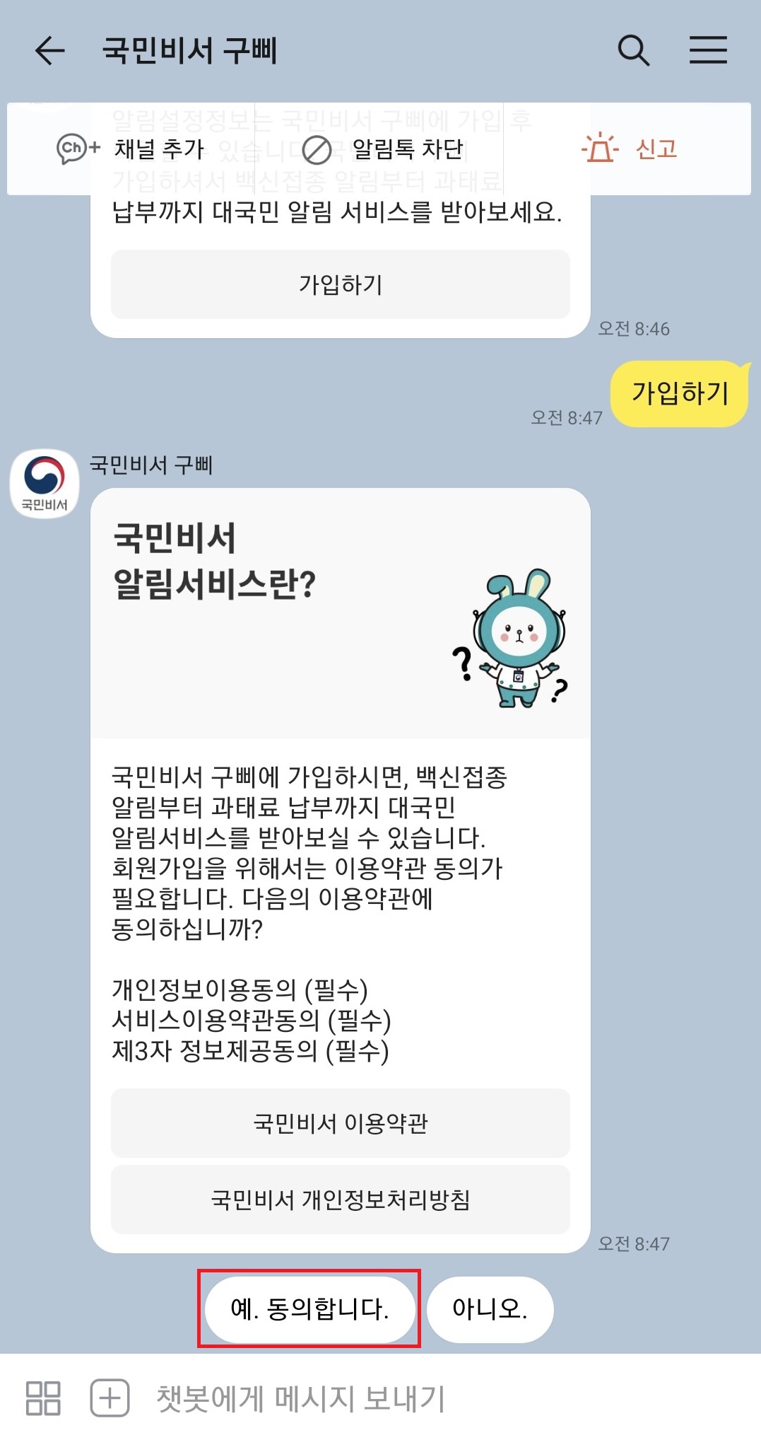 그 다음에는 나오는 것들을 다 클릭하면서 다음으로 넘어가시면 돼요. 개인정보 취급동의 및 국민비서 구삐 가입 해 주세요.