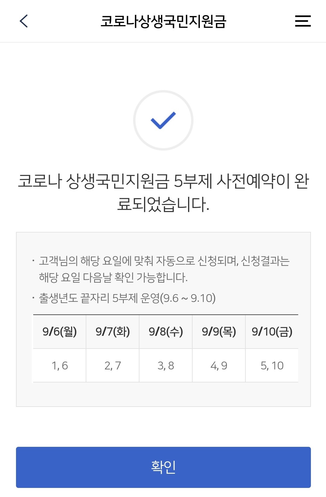 그러면 코로나 상생 국민지원금 5부제 사전예약이 완료되었다는 메시지가 뜹니다. 이 메시지가 뜨면 코로나 국민지원금 신청이 완료 된 것이에요. 비록 본인의 출생년도에 해당하는 날짜가 아니지만 신청이 완료 된 것입니다.
