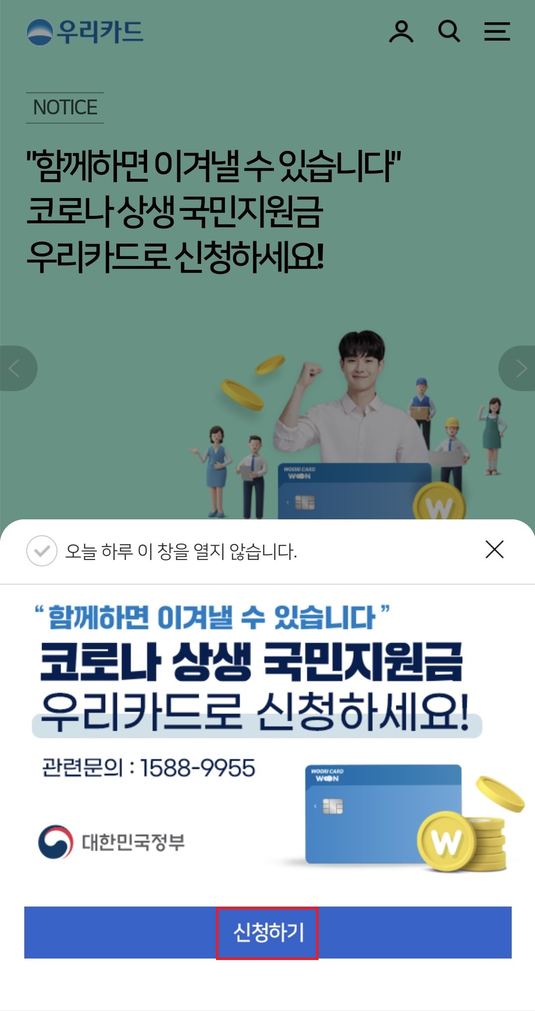 하지만 일부 카드사에서는 미리 신청을 할 수 있는 사전예약 서비스를 진행 하고 있습니다. 저는 우리카드를 통해 사전예약을 완료 하였는데요, 코로나 지원금 사전예약 방법 보여드릴게요.
