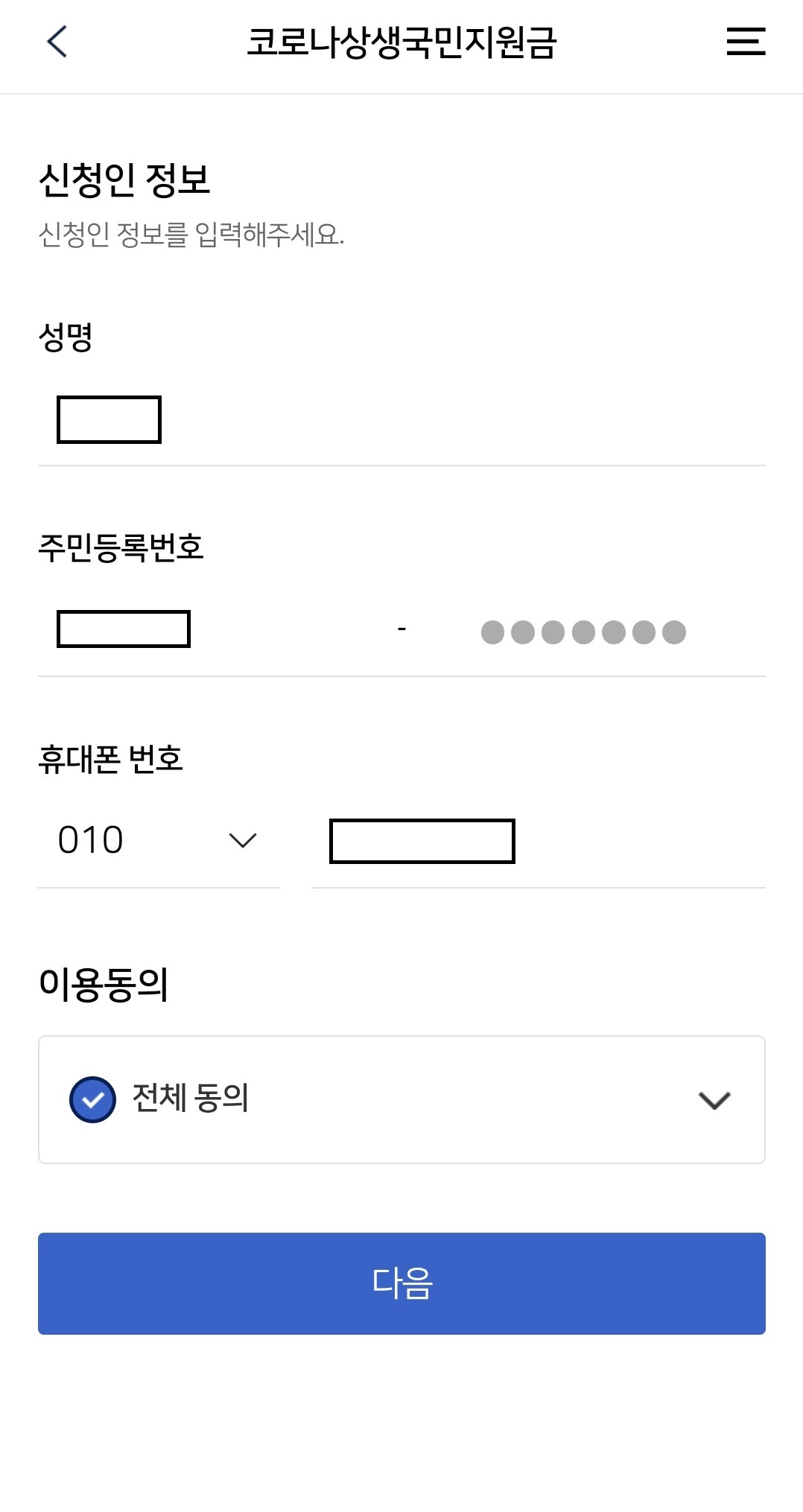 대부분의 카드사가 같은 방식으로 신청 가능할테니 내용 참고해서 본인이 신청을 원하시는 카드사 홈페이지나 앱을 통해 신청을 하시면 될 것 같습니다. 저는 우리카드 앱을 통해 신청을 했습니다. 우리카드 앱을 실행을 하면 위의 왼쪽 사진처럼 코로나 상생 국민지원금 신청하기 팝업이 나옵니다. 신청하기 버튼을 누르시면 이름, 주민등록번호, 휴대폰번호를 입력하는 페이지가 나오게 됩니다. 내용을 입력하고 다음 버튼을 눌러 주세요.