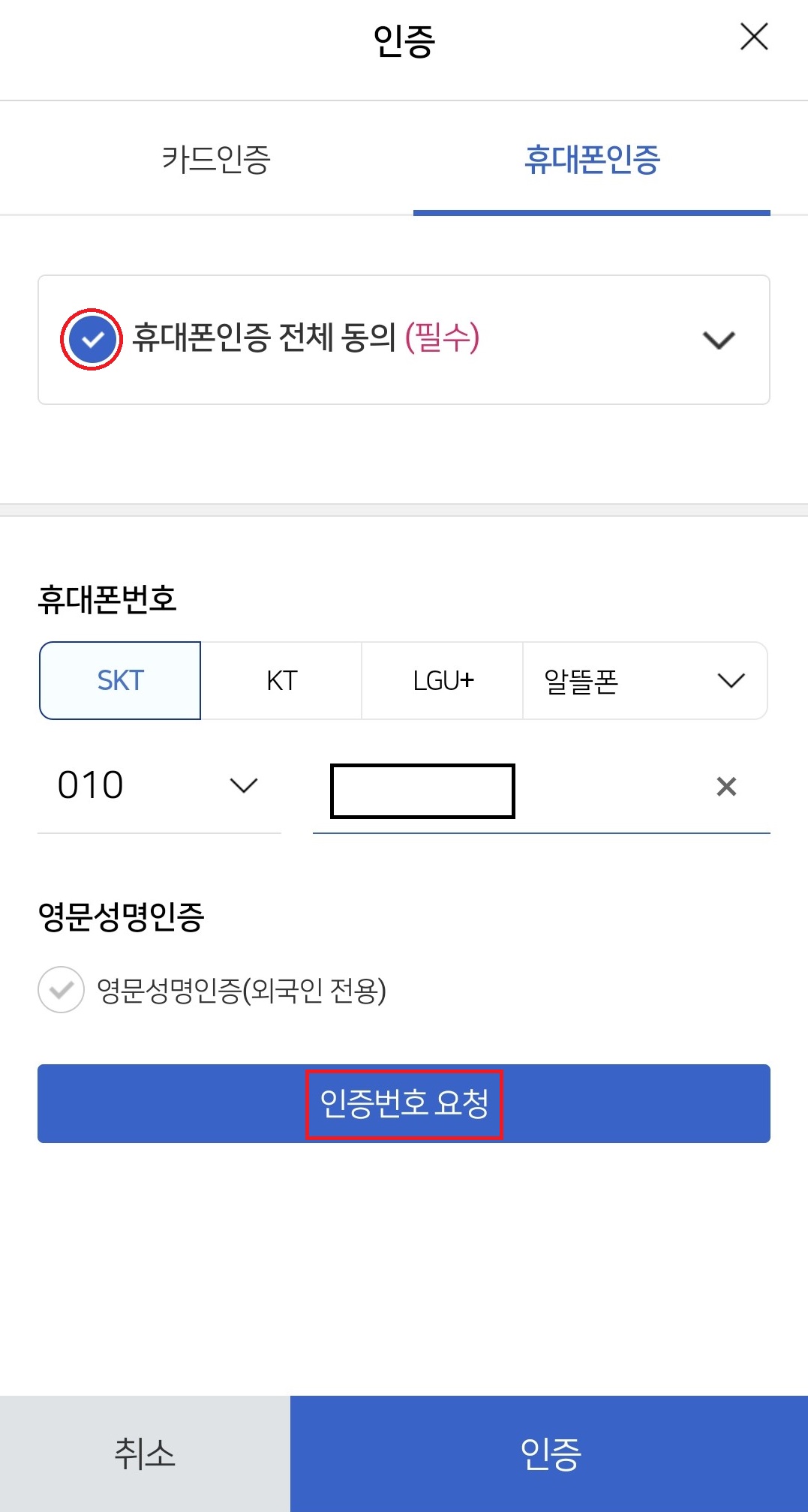 그 다음으로는 카드인증 또는 휴대폰인증 과정을 거치게 됩니다. 카드인증의 경우는 카드번호를 모두 기입하게 되어있어서 번거롭기 때문에 휴대폰인증이 훨씬 간편합니다. 통신사 선택 및 휴대폰번호를 입력하시고 인증번호를 요청, 문자를 통해 도착한 인증번호를 기입하시고 인증을 해 주세요.