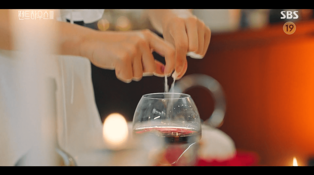 하은별은 엄마 천서진이 모든 기억을 잊고 행복하기를 바란다는 혼잣말을 하며 엄마의 와인잔에 기억을 잃게 해주는 약을 넣습니다.