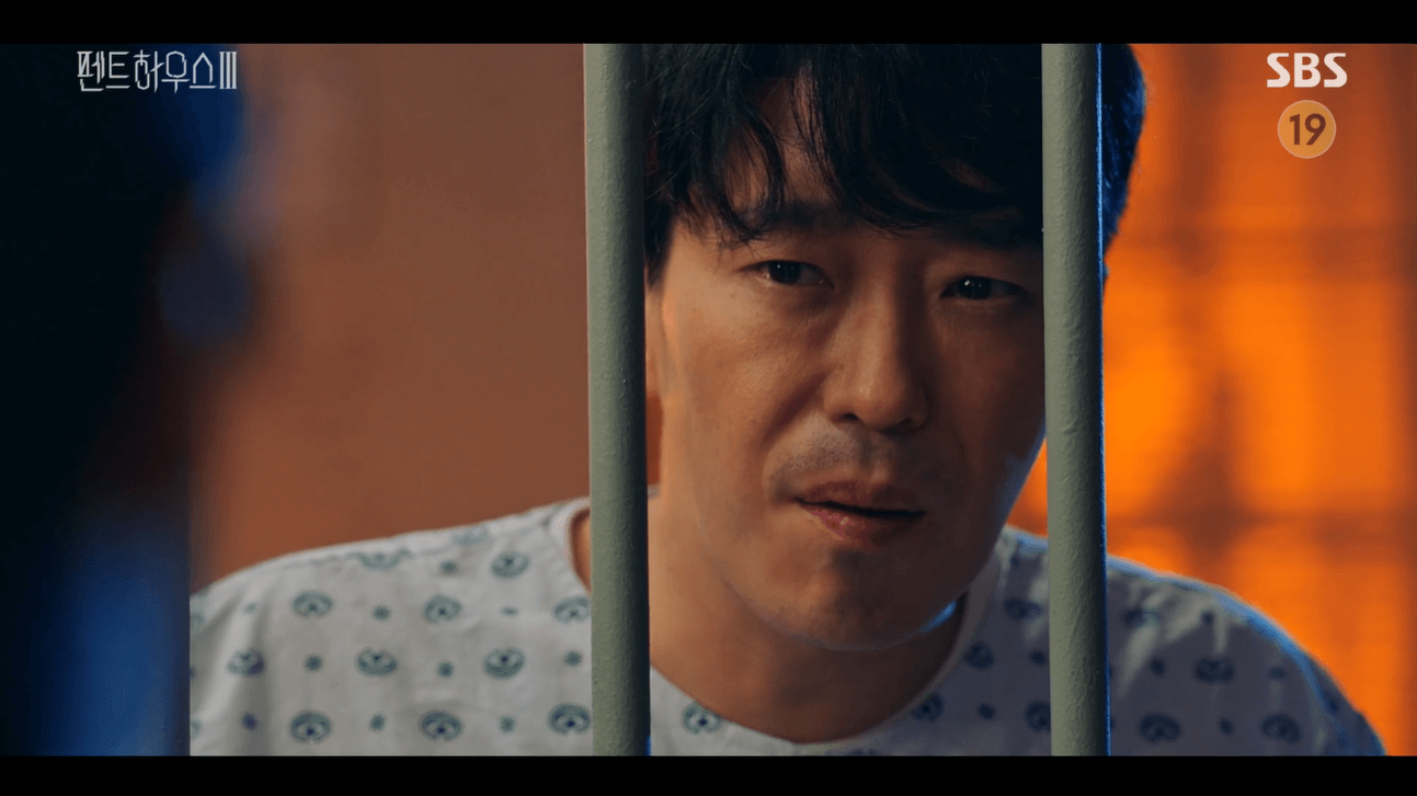 정신병원에 갇힌 주단태를 찾아가 기분이 어떠냐며 주석경이 비웃는 모습,