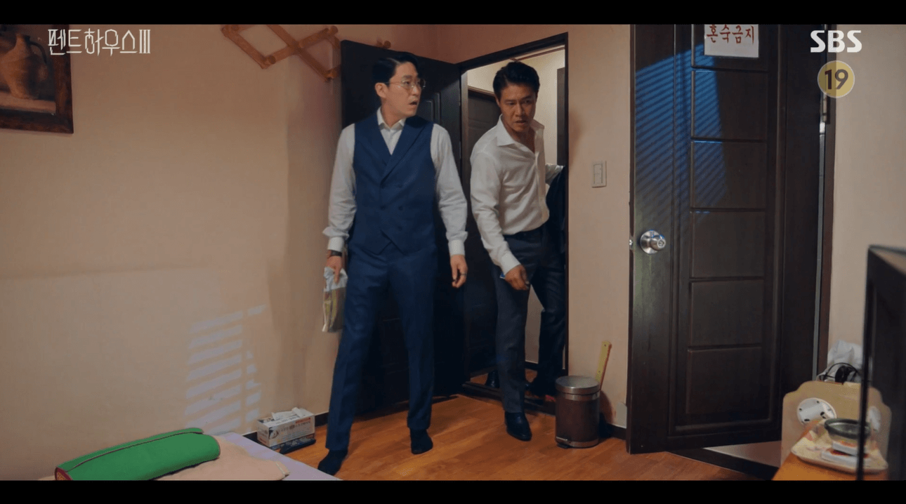 서로를 물어뜯을듯이 달려드는 주단태와 천서진. 주단태가 참석한 천수지구 개발 시공식 에서는 주단태가 로건을 죽였다는 증거 영상이 틀어졌고, 천서진의 이사장 취임식에서는 천서진이 전이사장 천명수를 죽였다는 문구가 적힌 그림이 공개됐었죠. 두 사람은 서로가 서로에게 뒷통수를 쳤다고 생각했습니다. 이들을 숨어서 지켜보고 있는 로건과 심수련. 이 두 사람이 꾸민 짓 이었겠죠.