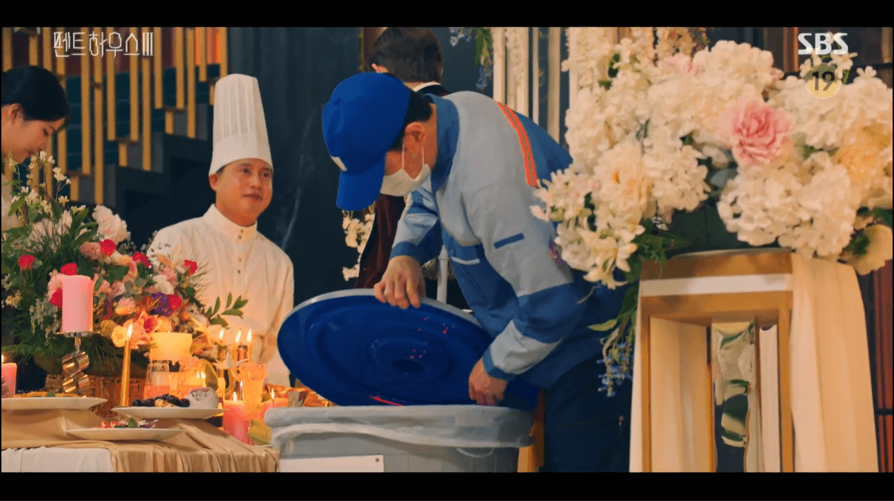 주단태는 청소 직원으로 변장을 하고는 로건과 심수련의 약혼식장 곳곳에 폭탄을 설치합니다.