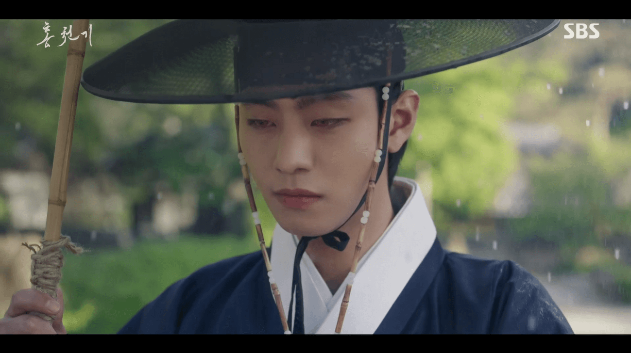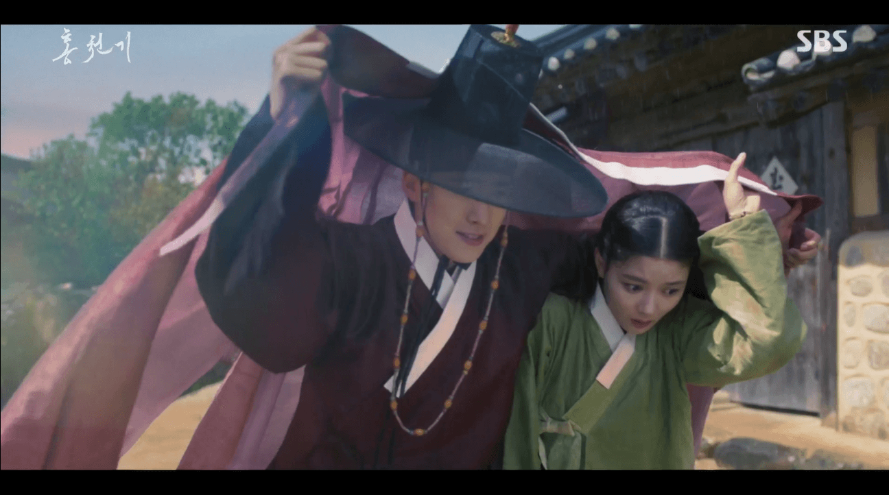 비를 맞고 걷던 홍천기에게 나타난 양명대군. 비를 막아줍니다.