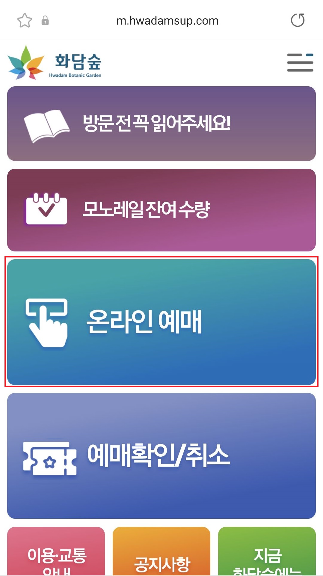 그럼 화담숲 예약 방법 알아볼게요. 원래는 화담숲 방문 시 현장 발권도 가능했으나 코로나19로 인하여 현재는 현장 발권은 불가하며 무조건 온라인으로 예약을 하고 방문하셔야 합니다. 저는 모바일로 화담숲 홈페이지에 방문해서 예약을 진행 하였는데요, 화담숲 예약 방법 보여드릴게요.
