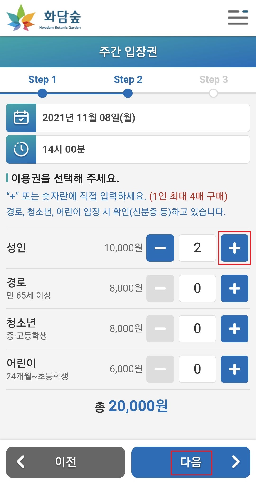 그 다음으로는 주간 입장권과 야간 입장권 중 선택을 하시게 되는데요, 현재는 야간 화담숲은 운영하고 있지 않으나 10월 15일부터 11월 14일까지 한 달간은 야간 화담숲도 운영이 됩니다. 주간/야간 중 선택 해 주세요. 저는 주간으로 예약했습니다.