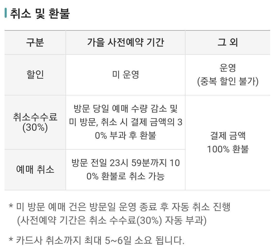 가을 사전 예약 기간 예매 취소는 방문 전날 23시 59분까지 하시면 100% 환불 가능합니다. 만약 당일 취소를 하게 되시면 30%를 제하고 70%만 환불이 가능하다는 점 참고 부탁 드립니다. 사전 예약 기간이 아닐 때에는 당일까지도 100%로 환불이 가능합니다.