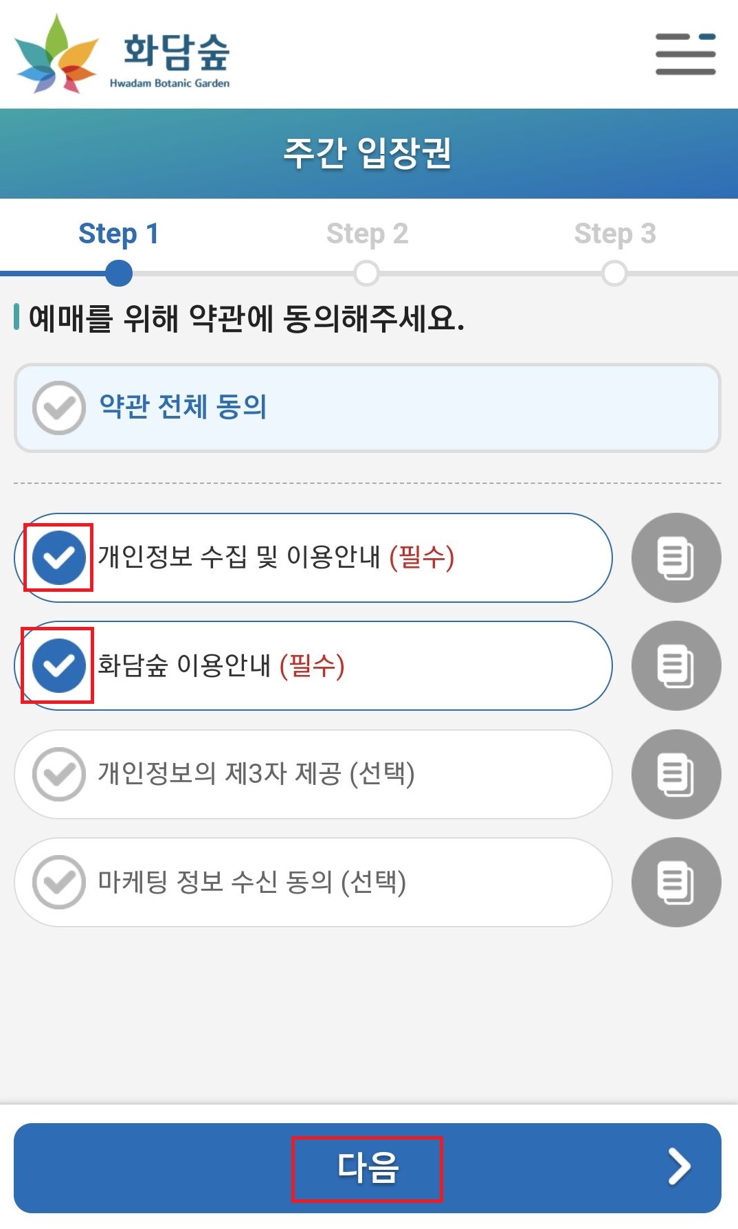 다음으로는 약관에 동의를 해 주셔야 해요. 필수 약관만 동의 해 주셔도 됩니다. 방문하고자 하시는 날짜를 선택하신 뒤 다음 버튼을 누르시면 예매 가능한 시간 및 수량을 확인하실 수 있을 거에요. 원하시는 시간을 선택하신 뒤 다음 버튼을 클릭 해 주세요.