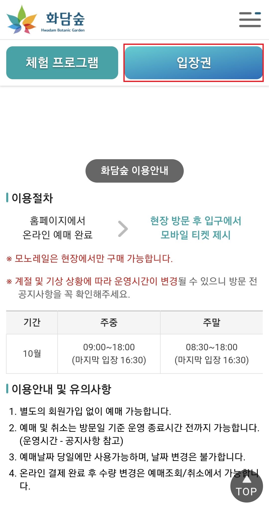 먼저 화담숲 홈페이지에 접속을 해 주세요. 화담숲 홈페이지에 접속하시면 온라인 예매 버튼이 아주 크게 보이실거에요. 온라인 예매 버튼을 눌러 주세요. 체험 프로그램, 입장권 버튼 두 가지가 보이실텐데 여기서 입장권을 클릭 해 주세요. 이용 절차 및 유의사항도 읽어봐 주시구요.
